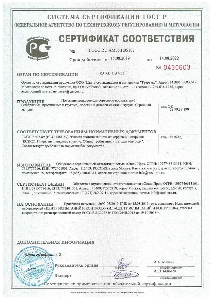 • Метод: Горячее цинкование по ГОСТ 9.307-89.